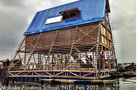What might be Lagos’s most internationally recognizable building project since the 1980s isn’t a skyscraper or a suspension bridge — it’s a one-room schoolhouse. The now well-known A-frame bobs in the murky surf of Makoko, one of Lagos’s largest slums, providing a learning space for a community of 100,000+ people not officially recognized by the city government. Designed by Nigeria’s rising star Kunlé Adeyemi, the project made waves in the architectural world last year for its simplicity, adaptability, and humanity. I first read (and blogged) about the project last fall and was struck by the auroral beauty of the blue-roofed building set against the cooking smoke and plain timber structures of Makoko where new homes are often constructed on a soggy foundation of raw sewage (see episode 2 of the BBC’s documentary Welcome to Lagos). Here was a project that had actually succeeded in that often sought but rarely realized gauntlet of creating low-cost, high-design buildings from recycled material to benefit poor communities. Write-ups poured in from the New York Times, The Guardian, and many others, and Makoko Floating School splashed across my newsfeed for several weeks.